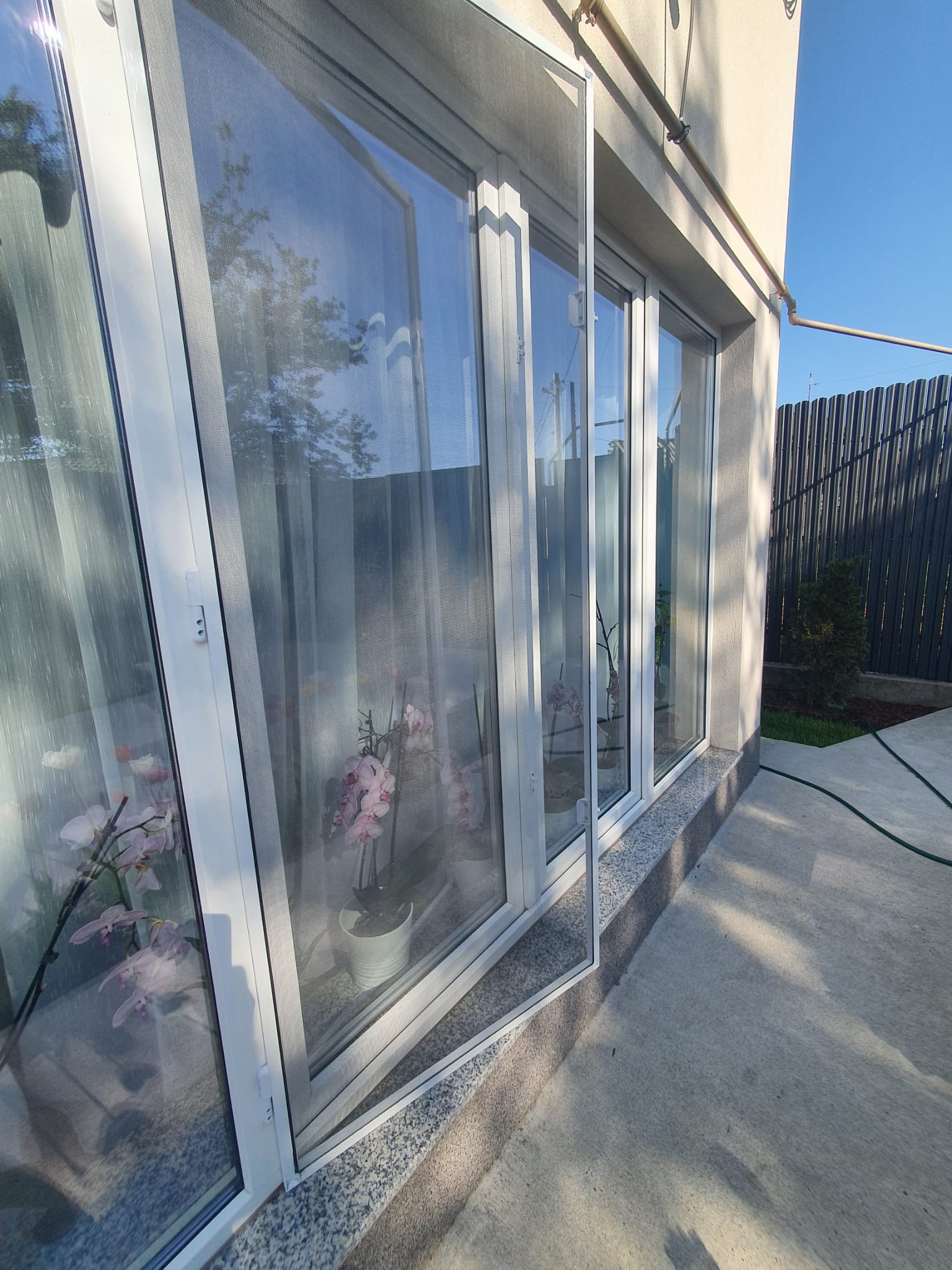 Pentru ușile cu mâner în exterior este nevoie de adăugarea unui pre cadru din aluminiu pentru a depărta plasa de mâner.